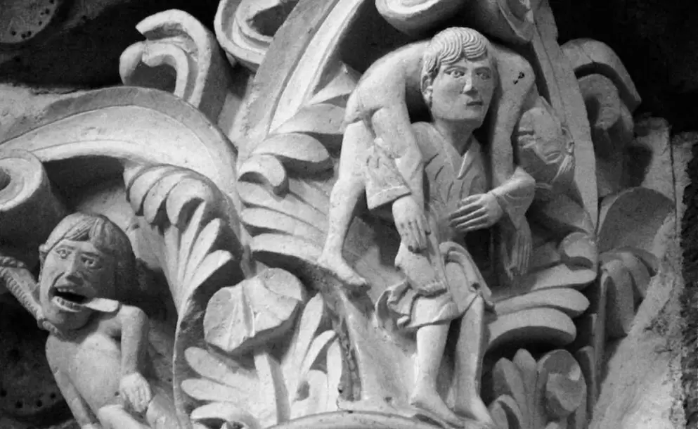 Bueno, en la nave de Vézelay hay una columna con unos capiteles tallados, unos relieves. Uno de ellos muestra la muerte de Judas y la muestra de una forma particularmente cruda. Está colgado con los ojos desorbitados y la lengua fuera y allí está colgado. Podríamos decir, ahí está Judas muriendo en la desesperación. Pero al girar la vista, el siguiente panel en la misma columna muestra a Jesús cargando sobre sus hombros, como si fuera la oveja perdida, la figura de Judas. Y Judas no está muerto, está vivo y sonríe mientras Jesús lo carga. Es una representación inusual, pero fascinante.